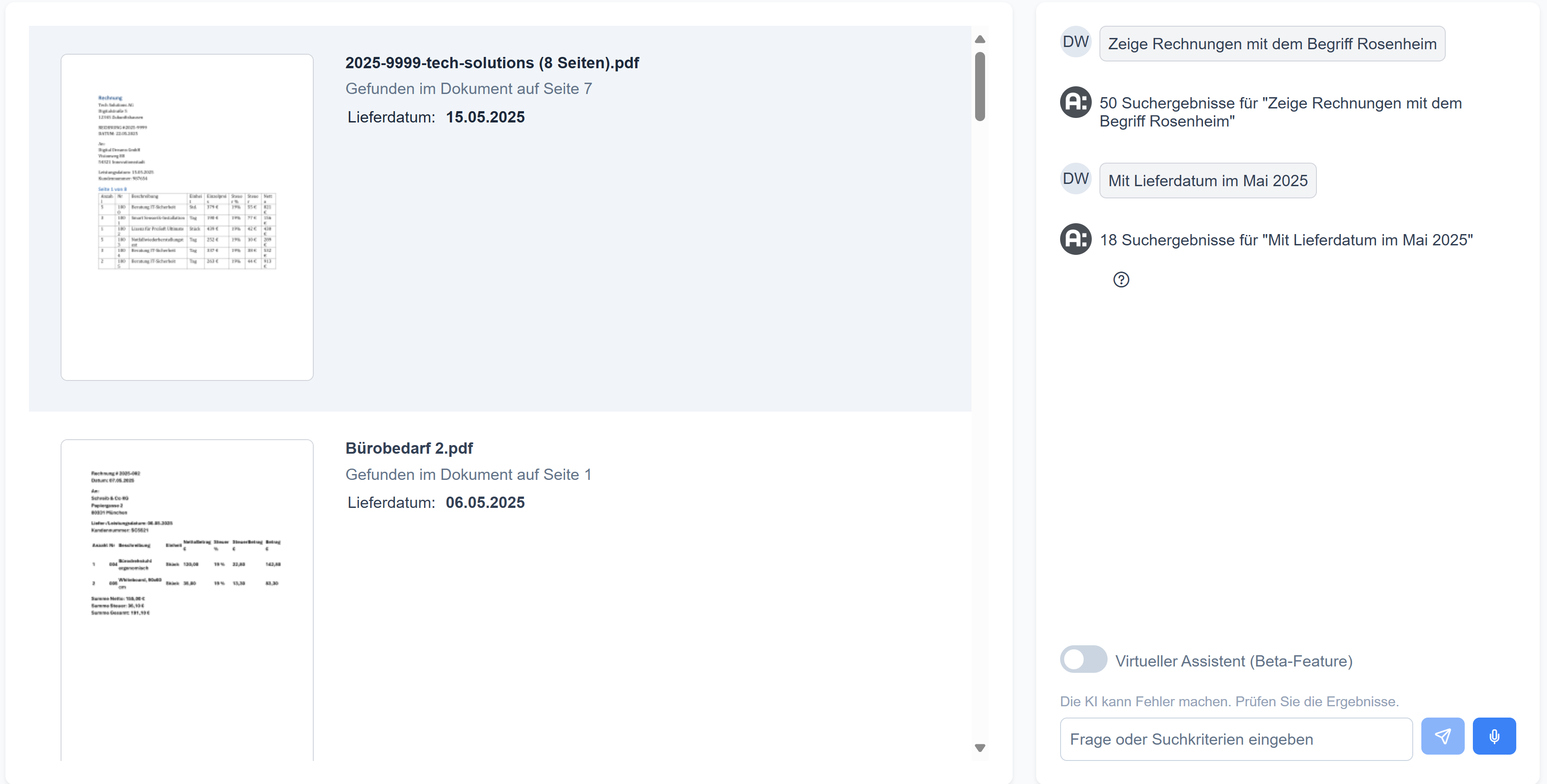 - Suche nach Zeiträumen, zum Beispiel: "Ich benötige die Belege von Müller GmbH zwischen April und Juli 2025. " oder "Liste die Rechnungen mit Lieferdatum vom 21.05.2025"