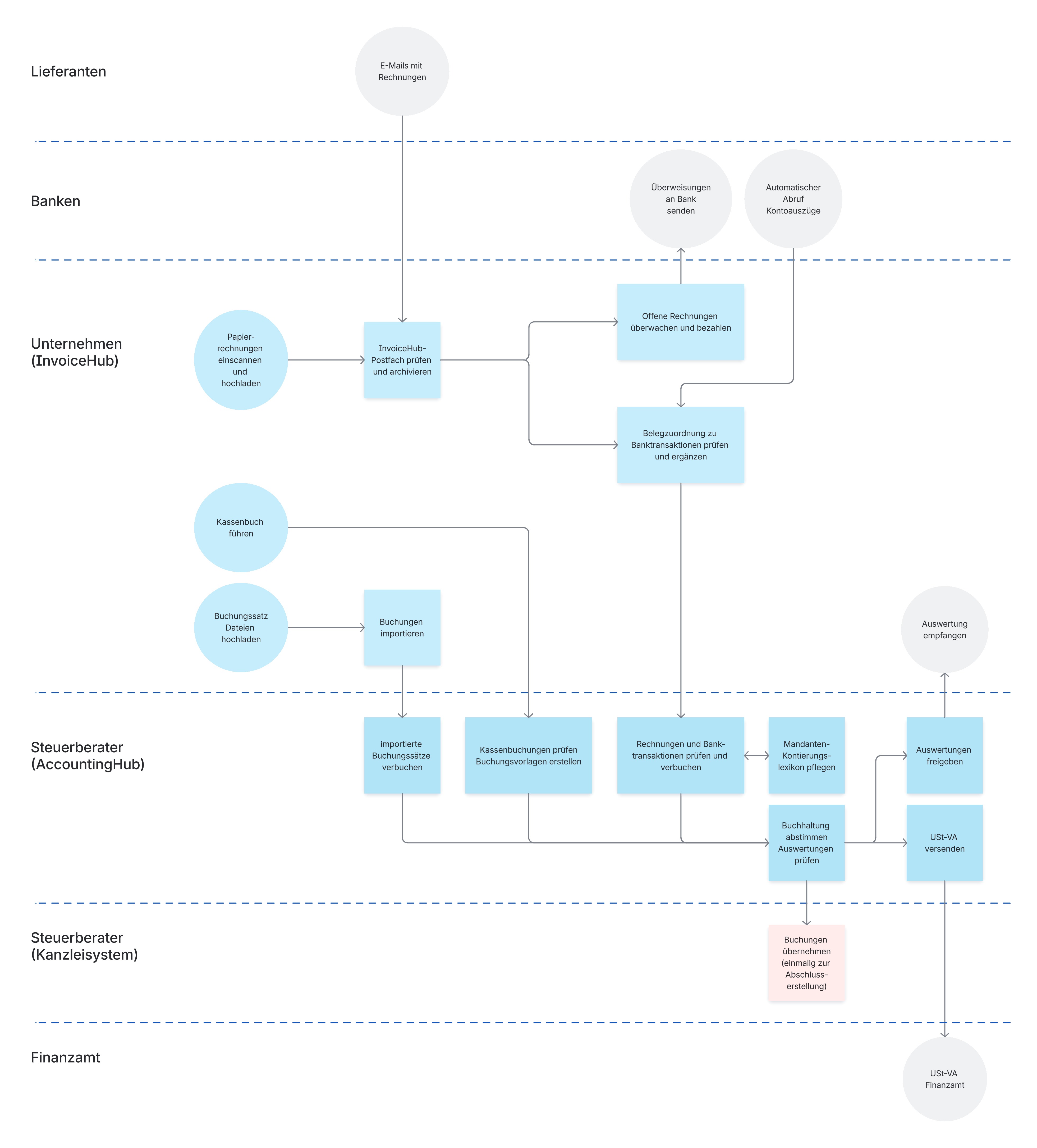Diese Musterkonfiguration ermöglicht die Zusammenarbeit zwischen Unternehmen und Steuerkanzlei in einem gemeinsamen System. Die laufende Buchhaltung wird vollständig in Agito InvoiceHub bzw. Agito AccountingHub erledigt, ohne Datenexporte in andere Systeme. Erst für den Jahresabschluss werden die Daten in das Kanzlei-Buchhaltungssystem übertragen. Das reduziert Fehlerquellen und spart Zeit bei der Datenübertragung.